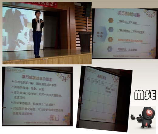 邢老师首先对近几年来行业的发展情况做了分析,鼓励即将走入就业大军的同学们及早做好准备,并生动地讲解了我们周围找到理想工作的师兄师姐的亲身经历,用举例子的方式告诉我们“机会只青睐有准备的人”;然后,就如何做好一份简历入手,提醒同学们在制作简历的过程中应该注意哪些问题,如何做到让自己的简历脱颖而出,通过一小段视频教育我们应该从企业的角度思考选择人才的标准;最后,刑老师又用几组对比照片,告诉我们面试前应该如何选择自己的着装,在面试过程中如何才能做到对答如流,从容镇定,机智的回答和巧妙的应对方法让全场高潮迭起。在将近一个半小时的讲座中,刑老师充满激情的演讲,深深感染到场的每一位同学,其深入浅出的讲解给同学们留下深刻的印象,本次讲座让更多的大学生明确自己择业方向,使我校学生能够有所准备而自信的迎接即将到来的招聘。
