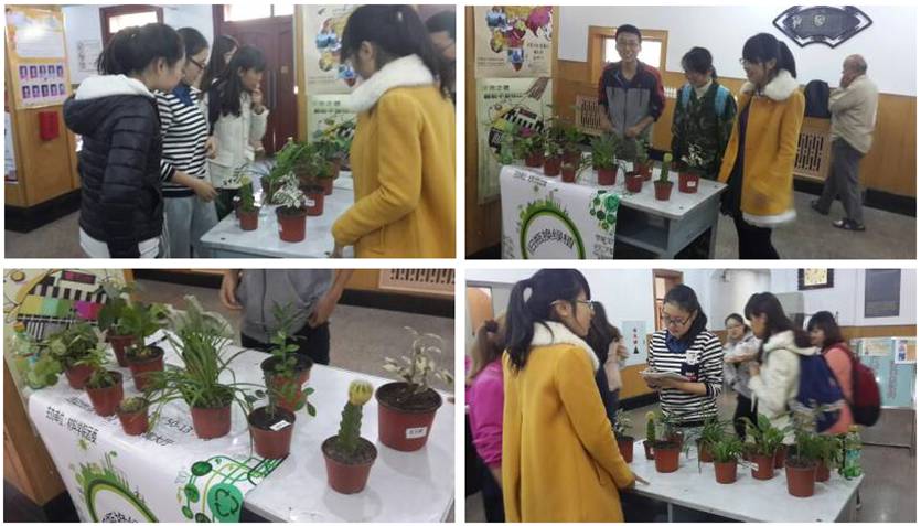 活动开始,工作人员向同学们一一耐心解释了活动规则:每位同学可以拿自己收集的10 个塑料瓶(易拉罐)换取一盆小盆栽, 或以20 个塑料瓶(易拉罐)换取一盆大盆栽,盆栽包括君子兰、仙人球、芦荟、富贵竹等诸多品种,台上一盆盆绿意盎然的植物很快便吸引了众多同学的眼球,同学们纷纷拿出在寝室中积存已久的塑料空瓶,争相换取植物,有些寝室甚至拖着麻袋集体出动。活动得到同学们的热烈支持和积极参与,在短短半个小时内,工作人员就收集到了500多个塑料瓶(易拉罐),换出40多盆适合在寝室中栽培的盆栽。活动得到了同学们的认可。