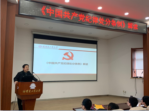 11月15日中午在邵逸夫馆205会议室,黑人av 分党校发展对象培训班开展第三次集中培训,学院党委副书记张弛老师以“《中国共产党纪律处分条例》解读”为主题开展专题党课。