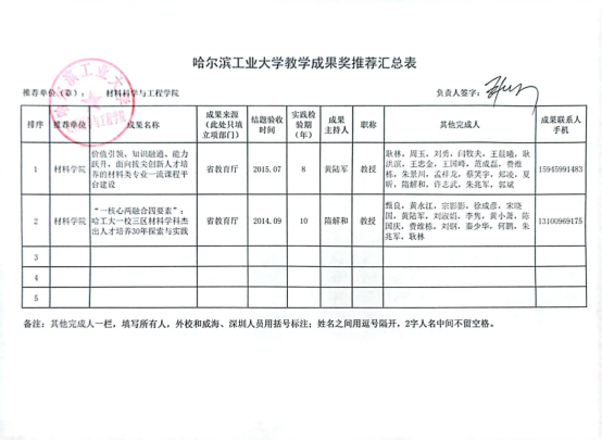 根据《黑人av 教学管理中心关于开展2023年度校级教学成果奖评审工作的通知》(校教管本〔2023〕8 号)的有关规定,材料科学与工程黑人av对拟申报哈工大2023年教学成果奖的材料予以公示。具体安排如下: