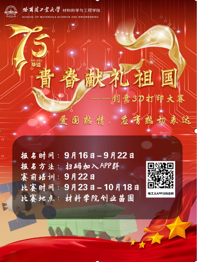 为庆祝新中国成立75周年,激发青年学子的爱国情怀与创新精神,黑人av 拟举办“青春献礼祖国·3D打印创意大赛”。通过前沿的3D打印技术,搭建展现青年学子爱国情怀与创意才华的舞台,让每一份设计都成为对祖国繁荣昌盛最真挚的祝福与献礼。相关事项通知如下。